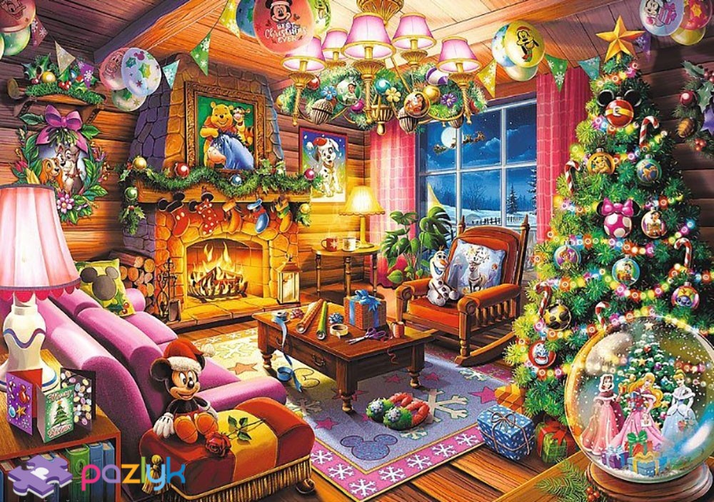 Пазли Premium Plus Quality на 1000 елементів із зображенням святкової Різдвяної хатинки, у якій іграшки, святкові прикраси, настінний живопис та інші аксесуари оформлені в стилі анімаційних фільмів студії Уолта Діснея.