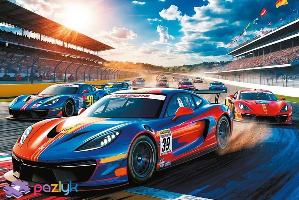 Пазлы на 100 элементов с изображением нескольких гоночных автомобилей.